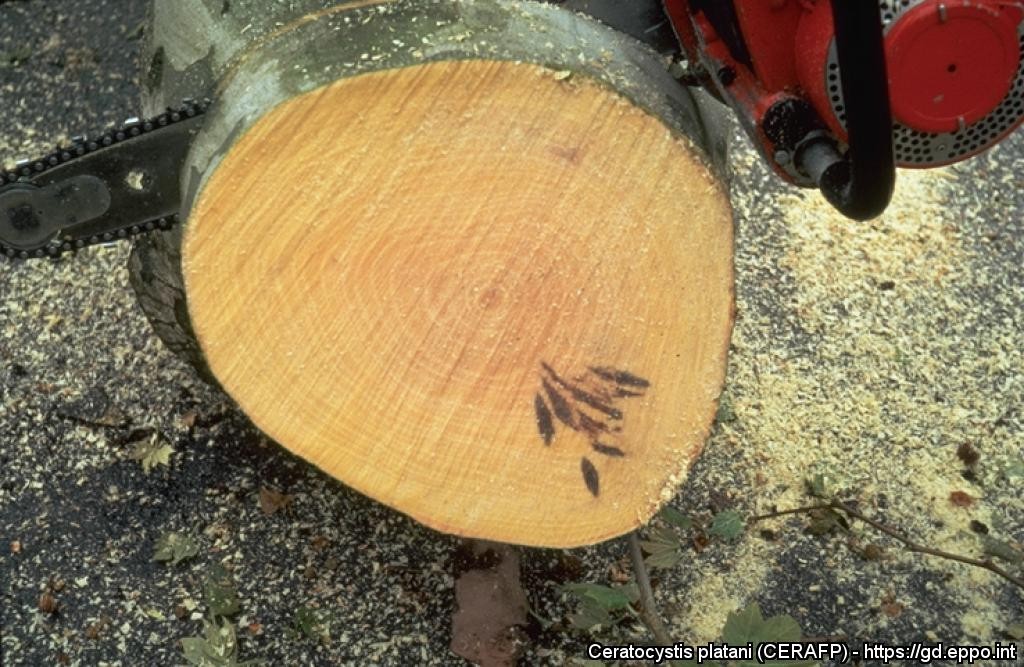 Transmission occurs through contaminated tools and machinery, as well as naturally via running water, wind, and root grafts between neighboring plane trees. Infected trees initially show violet-blue streaks on the trunk or large branches, which later turn orange. As the lesion expands, the center dries and darkens, the bark cracks, but the margin remains bluish without forming a healing callus. Above the infection site, the foliage becomes sparse and yellowed before the entire tree eventually dies.