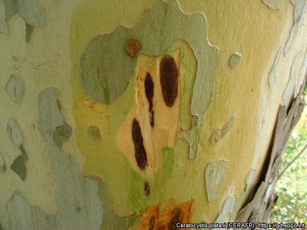 In urban settings, Platanus are often planted as a single species along avenues or in park settings. Following infection with Ceratocystis platani, the first symptoms to appear are chlorotic and wilting foliage on a single branch, possibly along with sap exudation from cracks in the branch and stem bark.