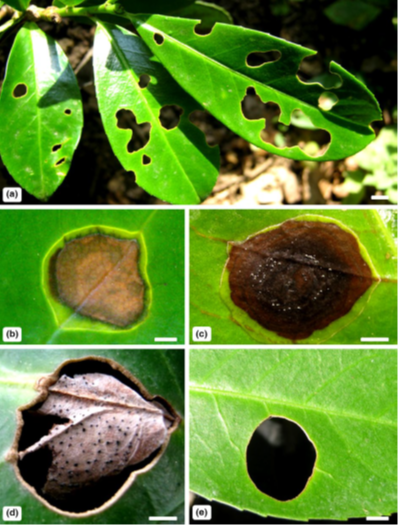 Several pathogens have been described to be involved in the development of shot hole disease symptoms on cherry laurel, including fungi (i.e., Neofusicoccum parvum) and bacteria (i.e., Micrococcus aloeverae, Xanthomonas arboricola pv. pruni , Pseudomonas syringae)