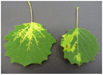 AsMaV-infected leaves of Eurasian aspen (P. tremula) showing vein yellowing (left) and yellow blotching (right)