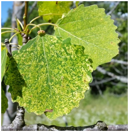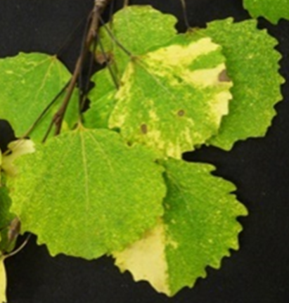 Leaves of AsMaV-infected Eurasian aspen (Populus tremula) showing chlorotic spots, variegation, and mottle.