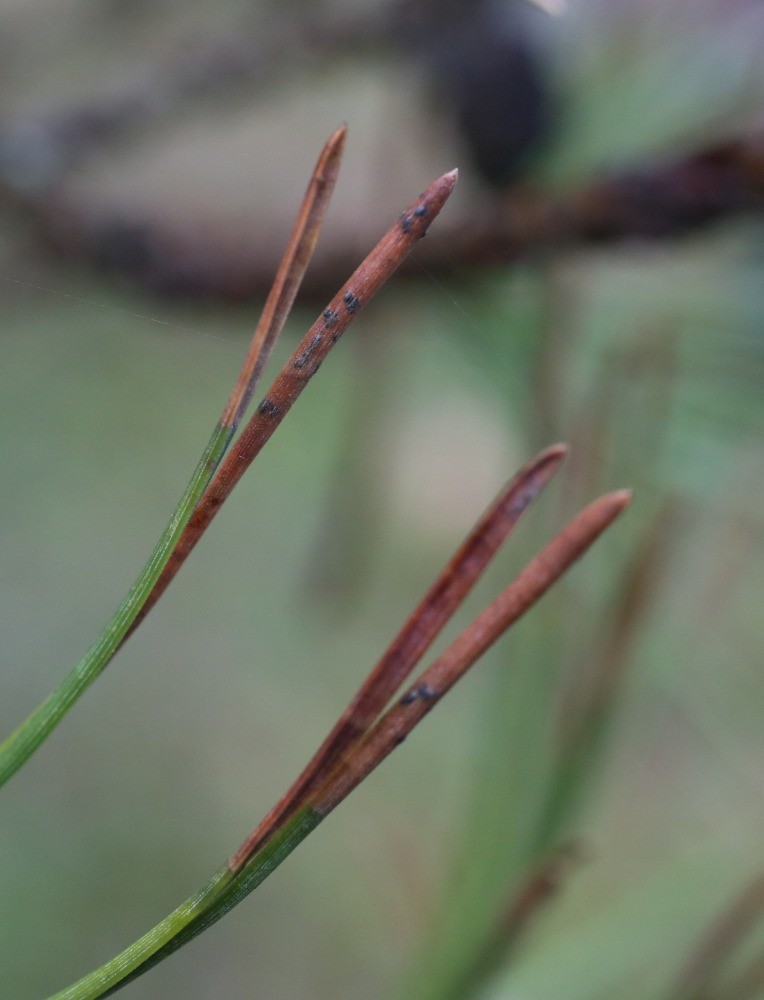 At the beginning of infection, a small yellow, sometimes light grey‐green or reddish brown, irregular circular spot, with defined margins, appears on the needles (Hedgcock, 1929). As the infection matures, the yellow spots soon become brown, resin‐soaked (depending on the host), and framed with yellow edges like a halo (Skilling and Nicholls, 1974). It might happen that the symptoms appear only as chlorosis without bands, for example on P. strobus (Broders and kt., 2015). Dark, subcuticular fruiting structures (acervuli) develop, releasing olivaceous, cylindrical, curved or straight conidia with 0-6 septa, rounded apex and truncate base, often with oil droplets, size ca. 30 x 4 µm (Jurc and Jurc, 2010; Tubby et al., 2023). The needles begin to die from the top towards the base before eventually shedding from the trees (Hedgcock, 1929; Skilling and Nicholls, 1974). Usually, only second and third-year needles are affected, leaving healthy new growth at the branch tips. New growth tips are infected through the inoculum on the old needles the following season. (Skilling and Nicholls, 1974).