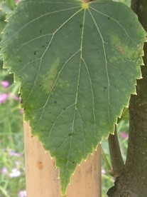 Leaf of a lime tree infected by the novel cytorhabdovirus tiliae showing chlorotic lesions.