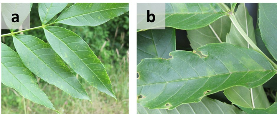 Leaflets of Fraxinus excelsior trees infected with cytorhabdovirus fraxini; a) chlorotic spots; b) chlorosis