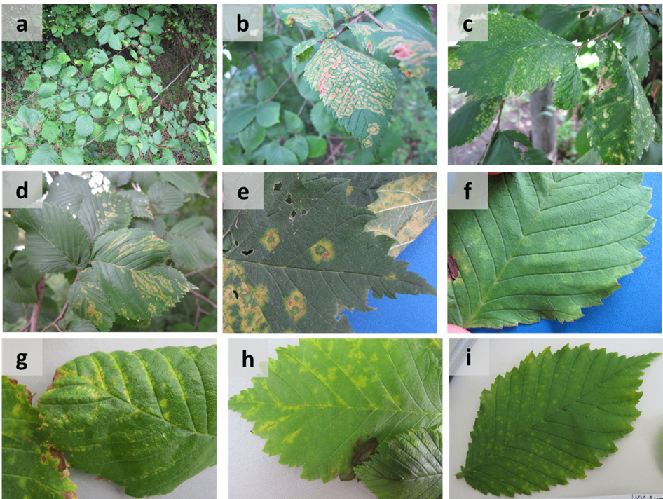 Carlavirus ulmi-associated leaf symptoms on infected elms. a) Chlorotic/necrotic spot, vein banding, vein yellowing, ringspots on leaves of trunk sprout; b) ringspots, chlorotic line pattern; c) ringspots, chlorotic line pattern; d) vein banding; e) +f) ringspots; g) +h) vein yellowing; i) chlorotic spots