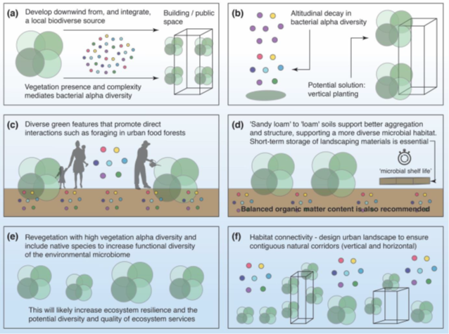 Image 3. Key strategies for enhancing urban microbiomes, including vegetation complexity, habitat connectivity, biodiverse revegetation, and soil management to promote ecosystem and microbial health (14).